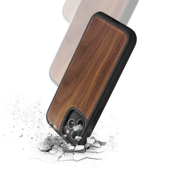 Das iPhone 12 mini Bumper Case ist aus echtem Walnuss-Holz hergestellt und verfügt über einen Silikonrahmen, welcher Stürze von bis zu 1.4 Metern Höhe auffängt.