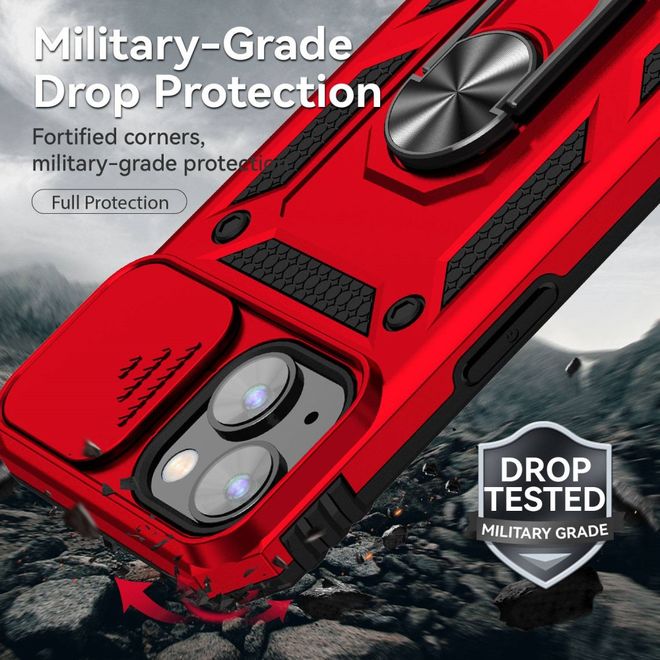 Robuste iPhone 14 Schutzhülle mit Kameraabdeckung und Klappständer aus der Kickstand Slide Cam Series in rot