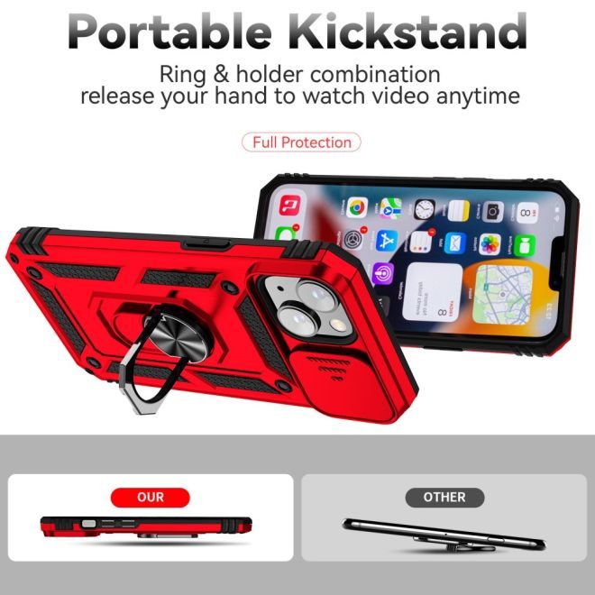 Robuste iPhone 15 Plus Schutzhülle mit Kameraabdeckung und Klappständer aus der Kickstand Slide Cam Series in rot