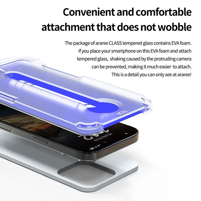 Schütze dein iPhone 16 Pro mit dem Araree CLASS Schutzglas und geniesse einen erstklassigen Displayschutz. Der innovative "Pull"-Mechanismus sorgt dafür, dass die Installation kinderleicht ist – selbst wenn du noch nie ein Schutzglas aufgetragen hast. Die Verpackung des Araree CLASS Panzerglases enthält zusätzlich zum Easy Install Kit einen EVA-Schaum. Wenn du dein Smartphone auf diesen EVA-Schaum legst und das Panzerglas anbringst, wird das Wackeln, das durch die hervorstehende Kamera verursacht wird, verhindert. So wird es viel einfacher, das Glas befestigen. Diese Liebe zum Detail findest du nur bei Araree!