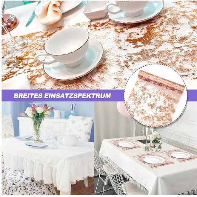 Der Tischläufer bringt festliche Eleganz und metallischen Glanz in dein Wohnzimmer oder deine Location. Das Tischtuch ist ca. 28 cm breit, 500 cm lang und kann einfach mit einer Schere auf die gewünschte Länge zugeschnitten werden.