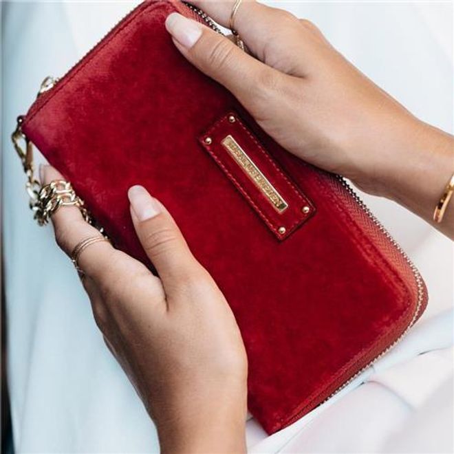 Die stylische universelle Wristlet Velvet Clutch ist in Rotgehalten und passt zu beinahe jedem Outfit. Tagsüber kann die Chelsea Wristlet Velvet als Geldbörse und abends dank dem abnehmbaren Goldkettchen als Handy Clutch angewandt werden. Aufgrund dieser Vielseitigkeit ist das Wristlet Velvet das perfekte Ganztags-Accessoire.