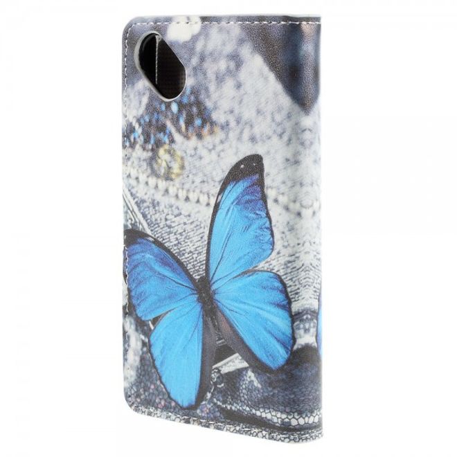 Wiko Sunset2 Leder Case mit wunderschönem, blauem Schmetterling